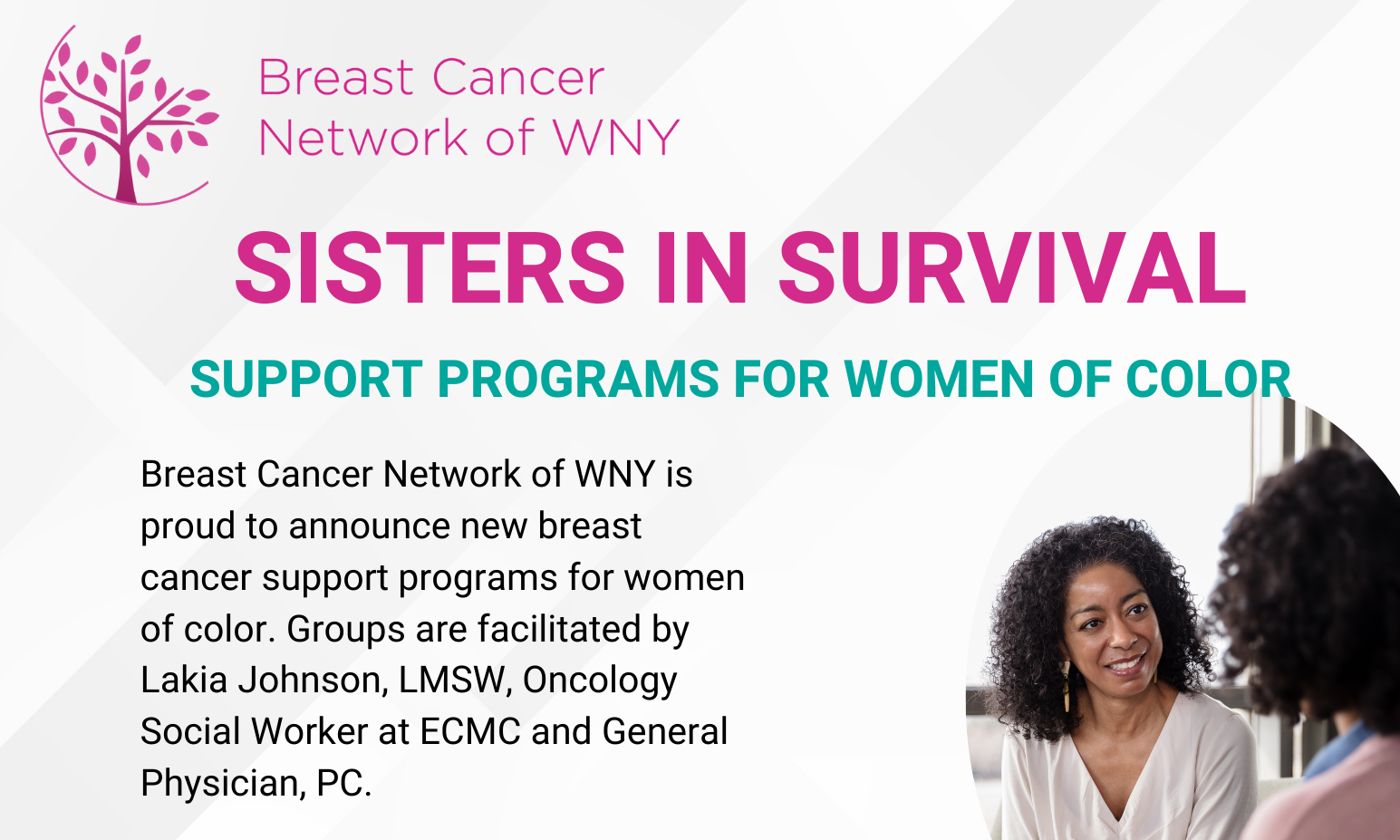 The Sisters in Survival support groups are designed for Women of Color who are transitioning from breast cancer treatment to survivorship. Facilitated by Lakia Johnson, LMSW and oncology social worker at Erie County Medical Center, these groups meet in person on the 2nd Monday of the month from 6:00 - 7:00 PM at Spot Coffee, 1406 Hertel Ave in Buffalo.