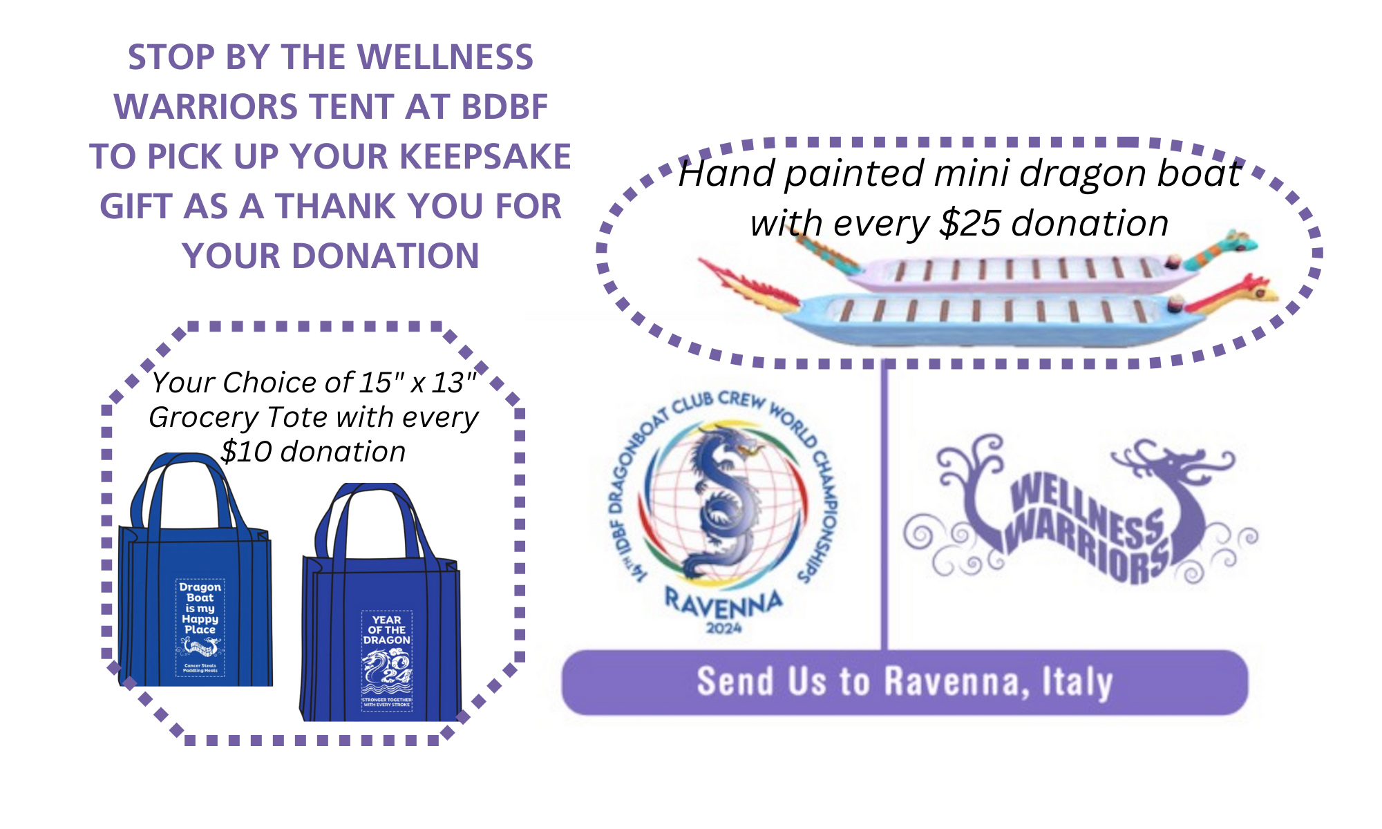 Please consider a $25 donation to support our survivor athletes and receive a dragon boat keepsake as a thank you. 3D printed and hand painted by cancer survivors this dragon boat keepsake shows off your support. There are only 50 mini dragon boats available so lift Wellness Warriors up at the start with your $25 donation.